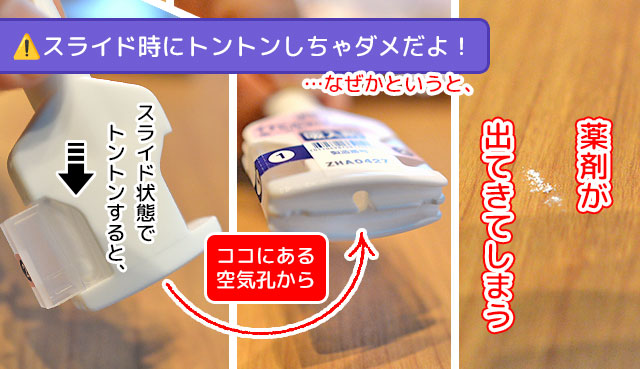 『薬剤が中央にセットされている状態』でトントンすると、底にある空気孔から薬剤がこぼれてしまうのです💦