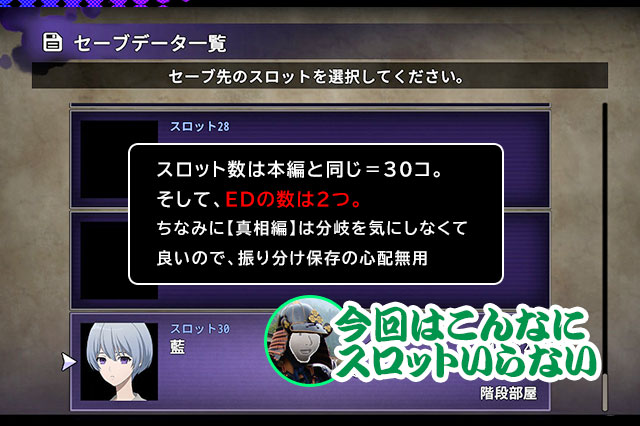 しかも、今回のED分岐はむちゃくちゃ終盤で分岐するので、セーブデータの振り分けを心配する必要がありません。