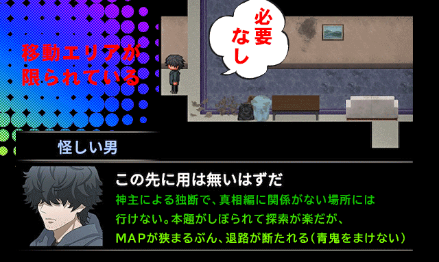 神主は『フロア構造・アイテムの場所を把握している』ので、行かなくて良い場所は『必要がない』として入ろうとしない。