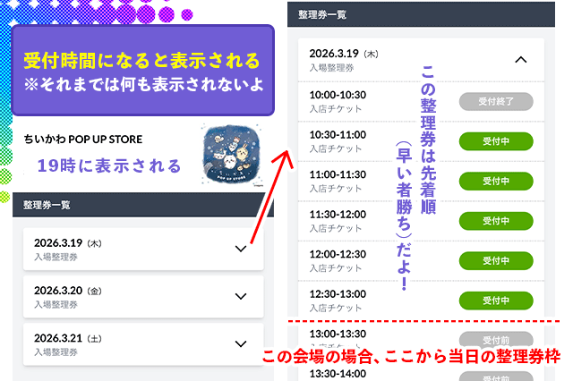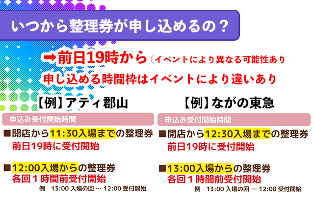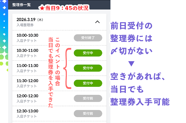 ❶ 整理券入場日の前日19時から受付する ➡ 午前中に入りたい場合