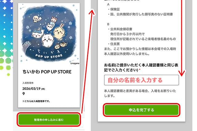 整理券の申し込みに進む > 名前を入力する ➡身分証明書どおり正確に > 申し込みを完了する