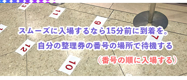 時間になったら、整理券の番号順に会場に入ります(入場のタイミングでは整理券の提示はしません)