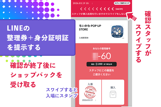 スタッフさんはスマホの『整理券の上部』をスワイプして👆【入場】スタンプを押します。