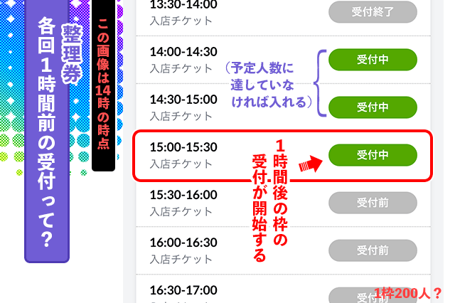 その時間枠でも『受付中』で整理券をゲットして入場できます。