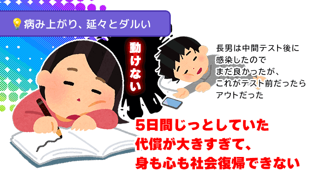 完治2日前から(症状が収束次第で)復帰のリハビリをしたほうが良い。少しずつ勉強を開始したり、暖かい時間帯に誰にも会わないように散歩したり。
