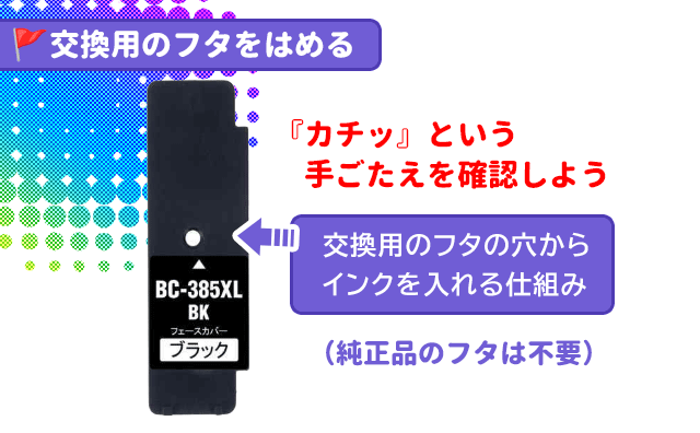 🚩先ほどの黒インクカートリッジを『インク補給ホルダー』にセット 👉上から補給ホルダーのフタをしめます。