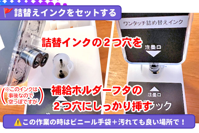 🚩詰め替えインクの2つ穴を、補給ホルダーの2つ穴に向かってしっかりと挿します。