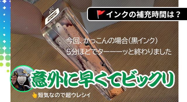 詰め替えインクの注入は意外と早く済んで…5分ほどだったと思います。容器が空っぽなのが確認できたら、引き抜いてください。