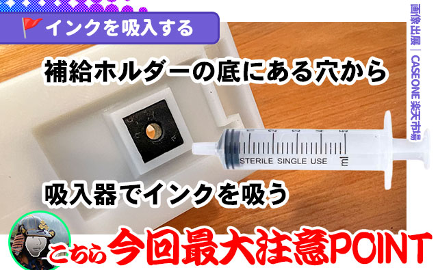 補給ホルダーの底にある穴から、吸入器でインクを吸います。