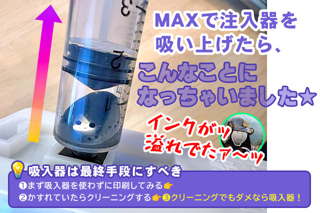💡2回クリーニングを実行しても改善できなければ👉強力クリーニングを実行。それでもダメなら最終手段…吸入器でインクを吸いあげてください。