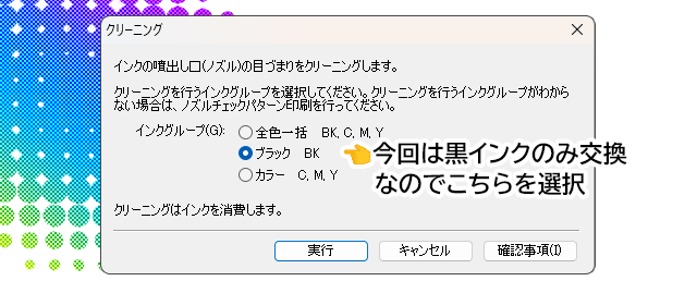 今回交換したインクにチェックし『実行』をクリック。