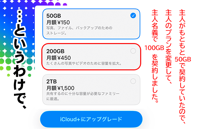 主人の契約を上書きして👉200GB/月額450円を契約しました。