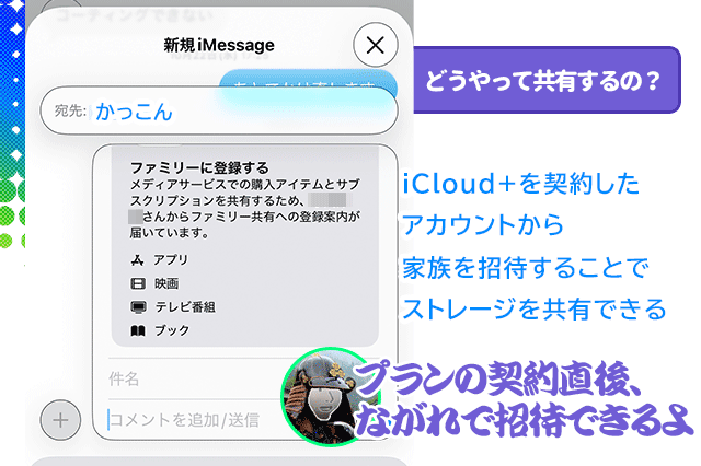 招かれた家族が、招待を承諾すると👉その瞬間からiCloudの領域が(契約分だけ)プラスされます。