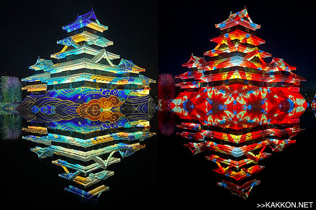 右手:赤い模様は万華鏡を思わせる動きで、艶やかに松本城を彩る
