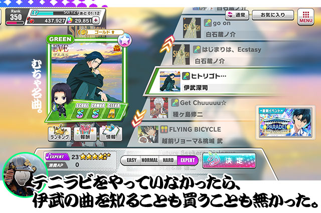 その後、前述のキッカケでテニラビを始めて、イベントで課題曲をこなしていくうちに、