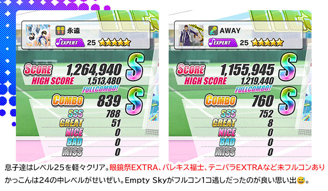 かっこんと次男、最初は見れたモノではないプレイレベルでしたが、日々を積み重ねた結果=❶かっこんは24中レベル、❷次男はレベ25がきちんとクリアできて、未フルコンは数曲だけ。長男は始めから上手かった…😅